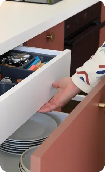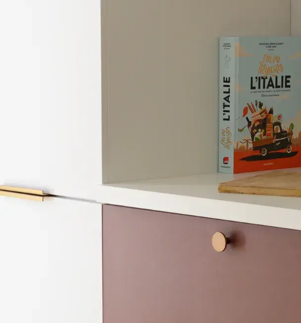 Cette idée a évolué vers une cuisine en U avec un petit retour pour accoler ou non sa table et moduler selon les envies et l'évolution de la famille. Cela permet aussi une circulation fluide sans délimitation. Julia a testé différentes combinaisons avec le vert eucalyptus puis a évolué vers le rouge brun en association avec le blanc premium pour les meubles hauts et les colonnes. Un vrai coup de cœur pour Julia. Aussi, séduits par la proximité, ils sont venus chercher leur cuisine et ont posé eux-mêmes.