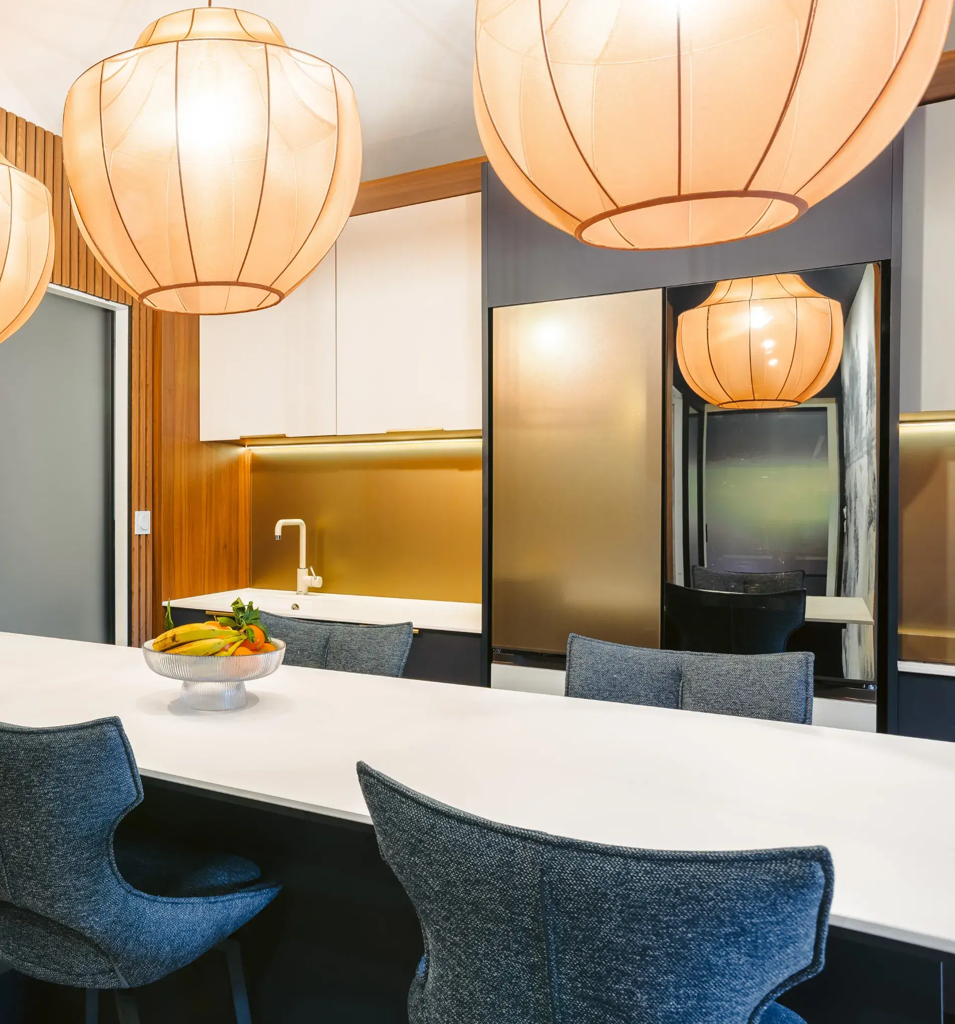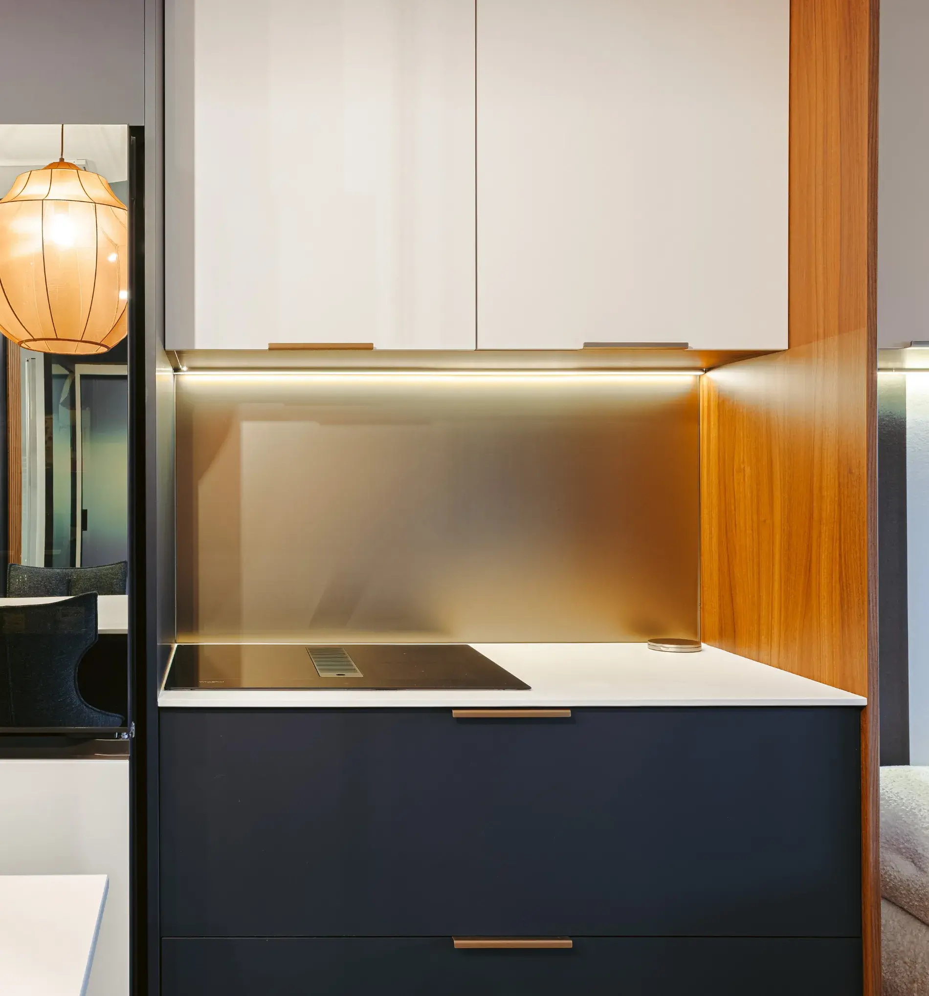 Pensée comme une pièce forte de l’appartement, cette cuisine joue avec les couleurs et les matières pour créer un espace vivant et structuré. L’équilibre entre fonctionnalité et esthétique permet de révéler toute la personnalité du lieu.