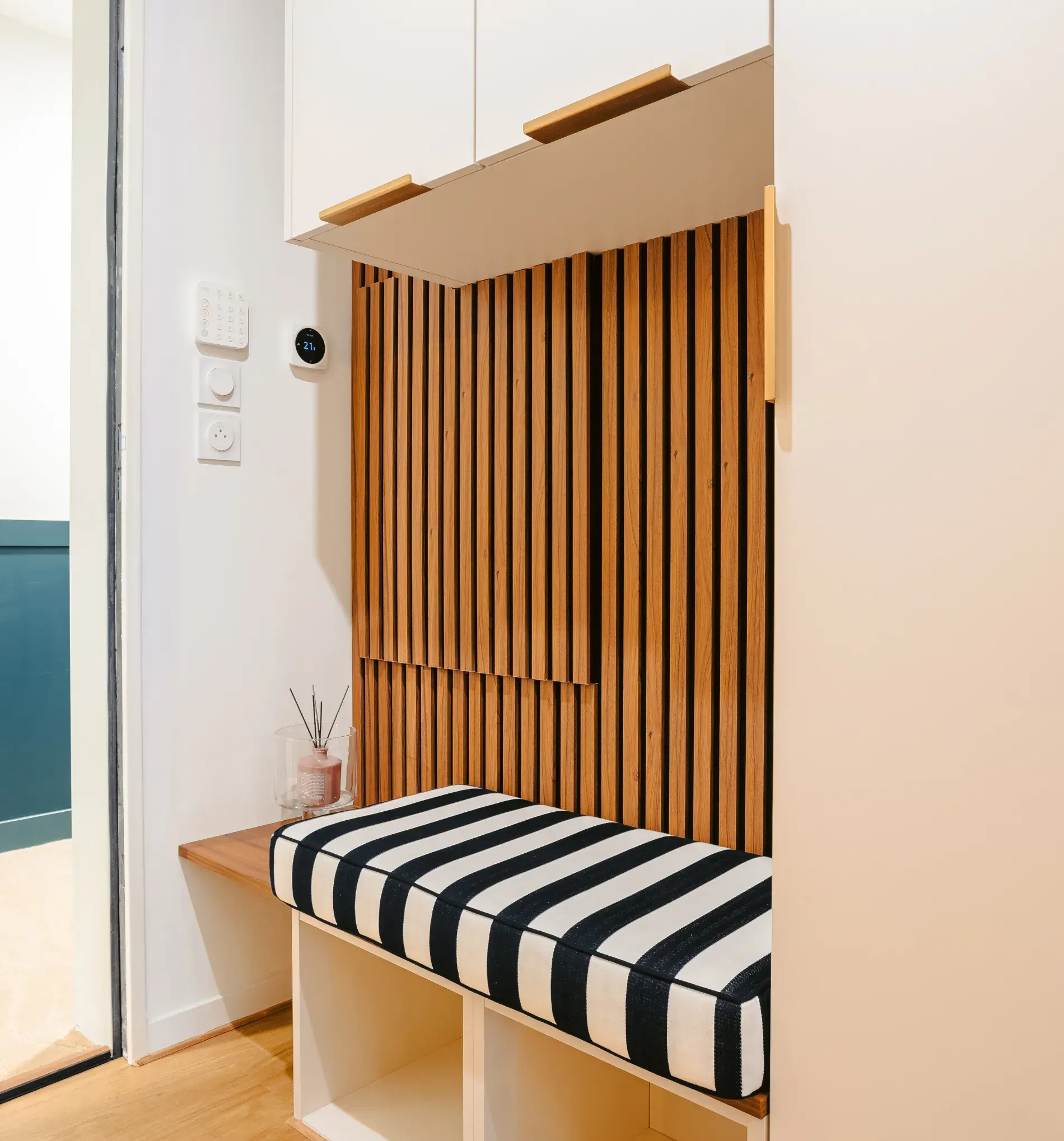 Initialement pensée autour de finitions terracotta et noyer de Bourgogne, la cuisine a évolué au fil des échanges avec sa conceptrice Emilie pour intégrer le bleu indigo mat et le lin ivoire, créant une harmonie avec le reste de l’appartement et le papier peint rayé. Très précise dans ses attentes, Céline avait déjà réalisé un premier plan avant de nous solliciter pour affiner les finitions et optimiser le projet. Elle souhaitait une cuisine fonctionnelle avec électroménager entièrement encastré, incluant un réfrigérateur déjà acquis. Le projet trouve ainsi son équilibre entre couleurs, textures et usages, dans un esprit ensoleillé et inspiré du bord de mer. Convaincue par l’accompagnement, elle a confié l’ensemble de la conception de son appartement à Emilie.
